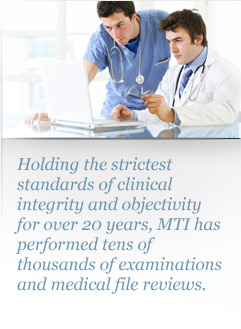 Medical file reviews are utilized to assist in evaluating cases. Usually the focus of a file review is to assess causation, impairment, and appropriateness of care. Dependent on the case, file reviews can be a timely, valuable cost saving service in lieu of an independent medical examination. We perform file reviews for workers compensation, automobile accident and private disability cases as well as return to work situations. Our clients range from Fortune 500 corporations, insurance companies, third party administrators, state agencies, self-insured’s, insurance companies, unions, and the best legal firms. With 20 years of experience, MTI has performed tens of thousands of examinations and medical file reviews. MTI has always held itself to the strictest standards of clinical integrity and objectivity. Our foundation of success is directly attributable to our commitment to bring professionalism, reliability and impartiality to the medicolegal processes.